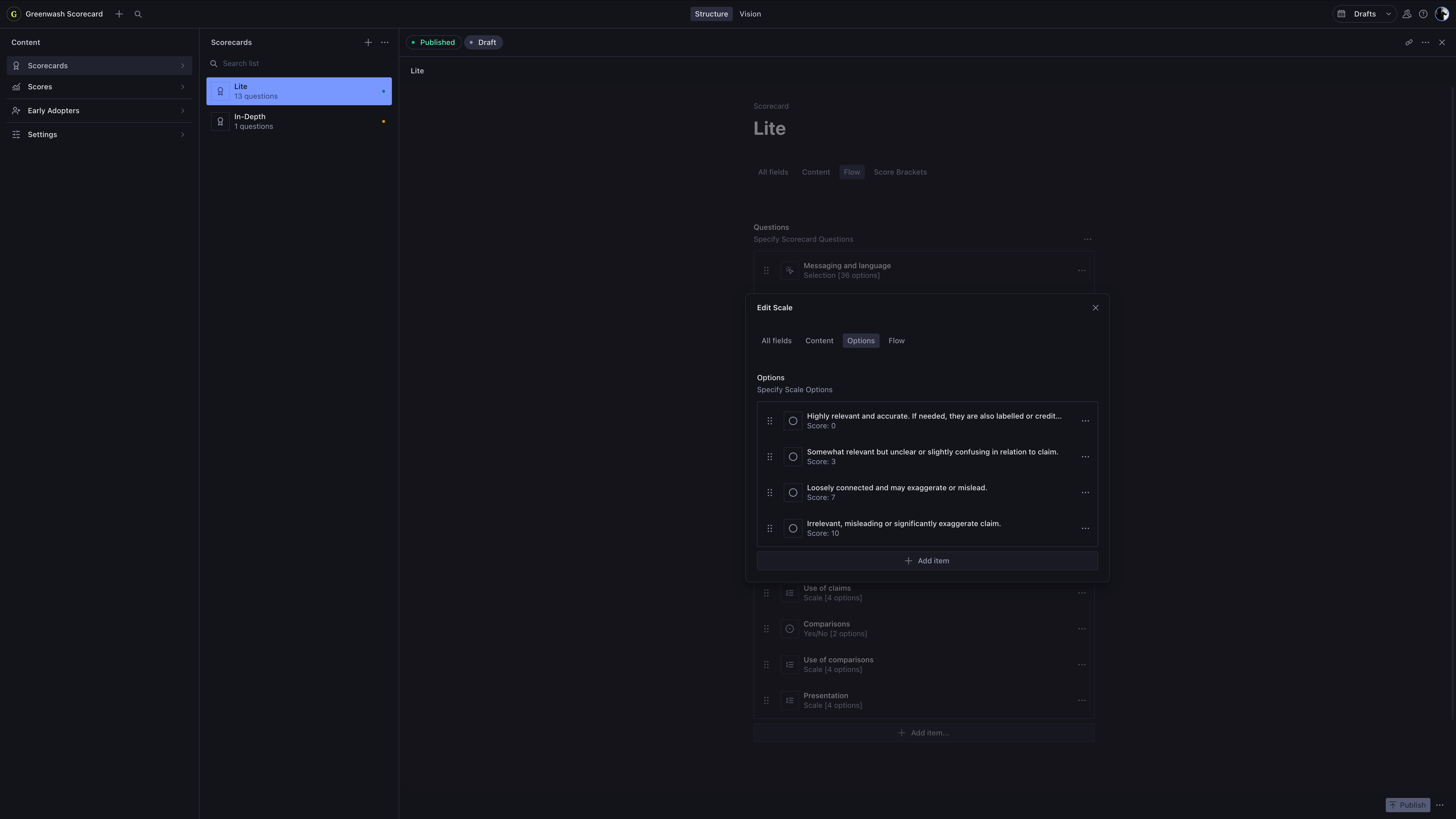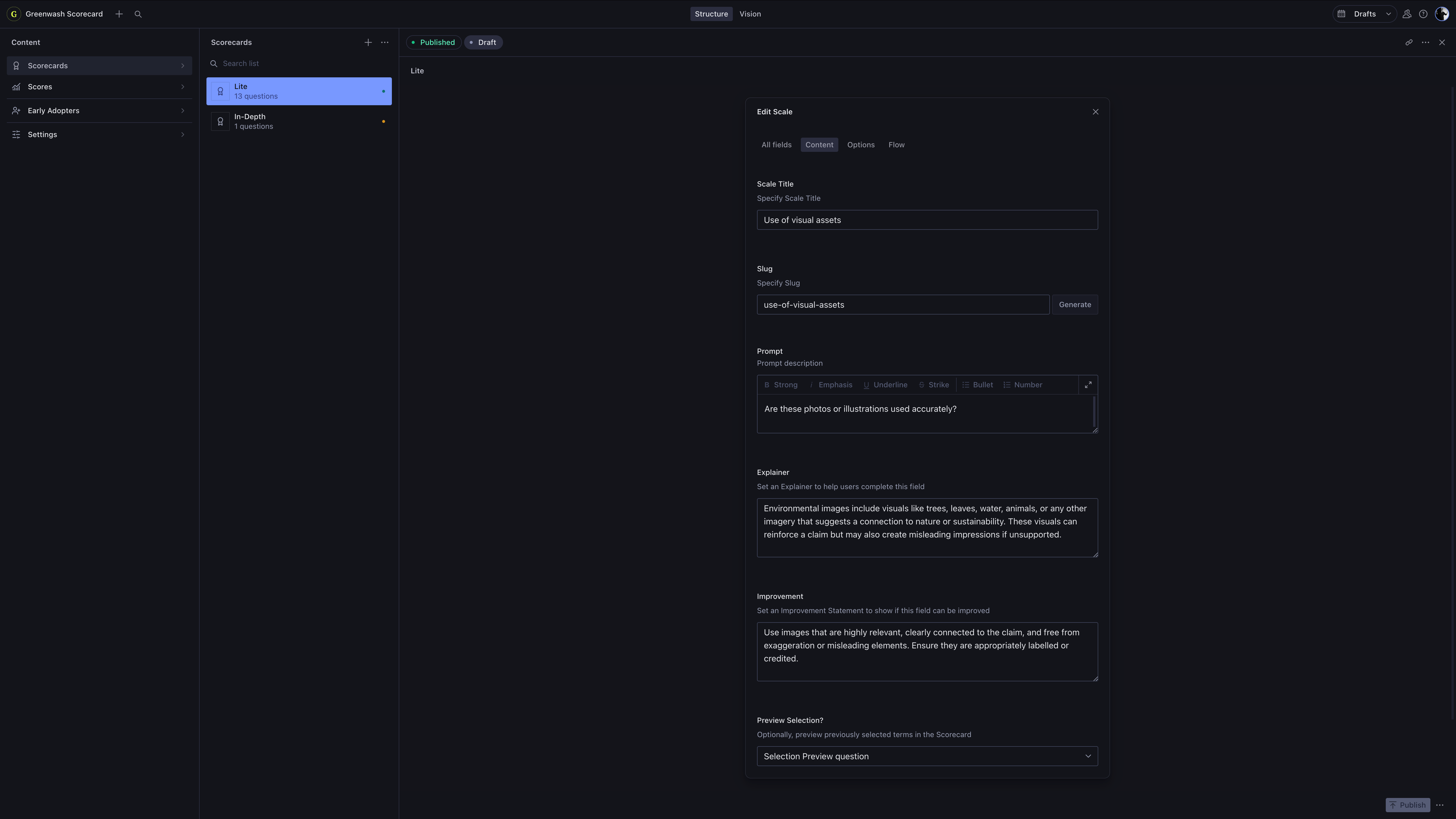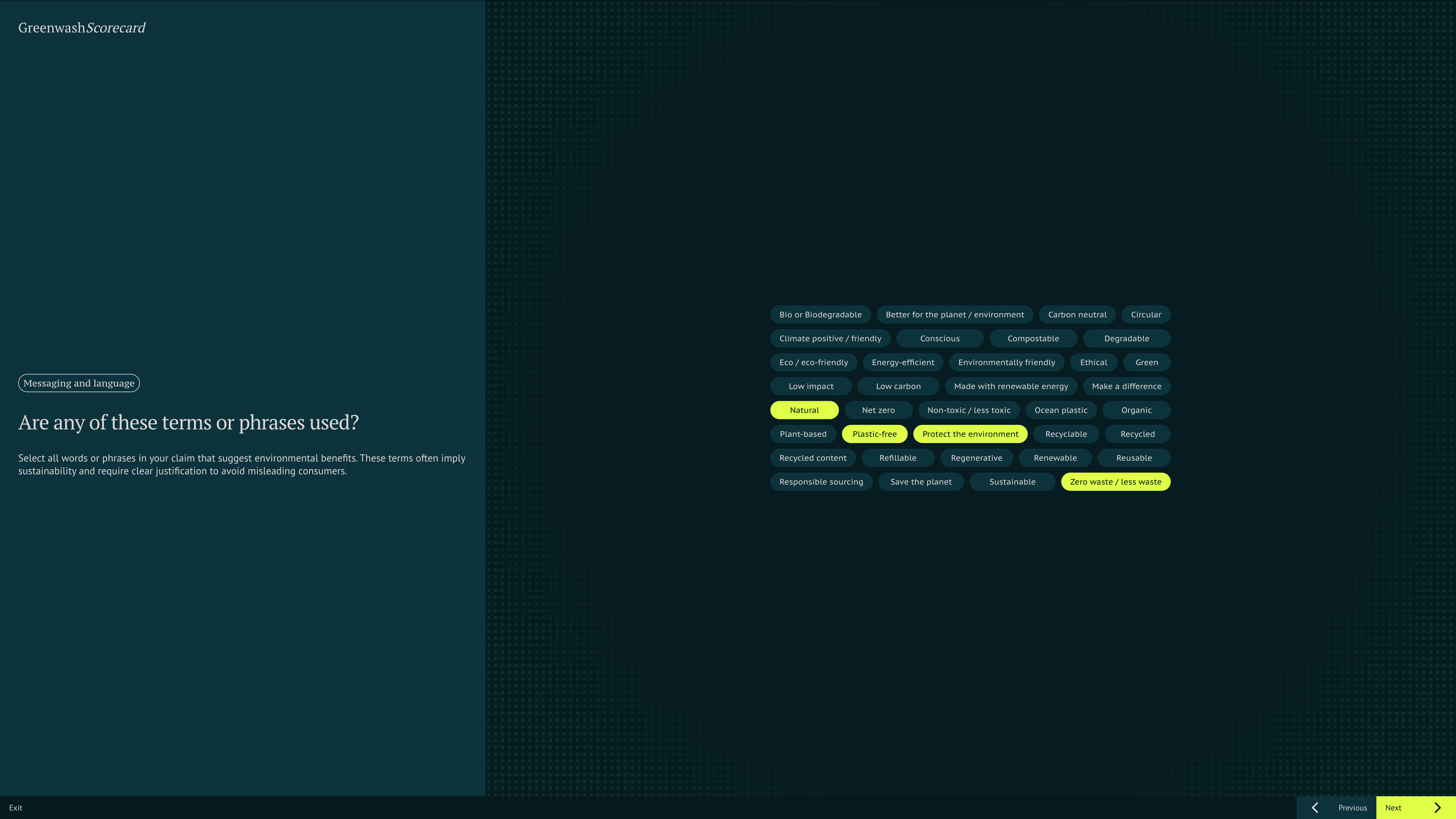 From a technical perspective, Greenwash Scorecard was built using Next.js, Zustand, Zod, and Sanity for content management, configuring assessment flows, and storing user assessments.